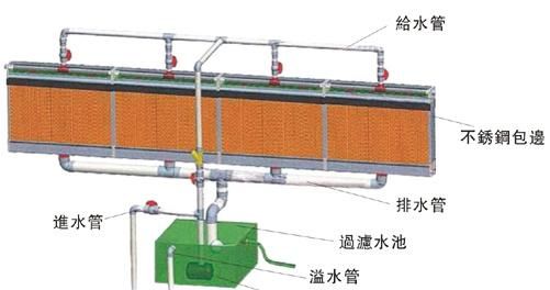一、降溫系統(tǒng):1.“濕簾-負(fù)壓風(fēng)機(jī)”降溫系統(tǒng)是由紙質(zhì)多孔濕簾、水循環(huán)系統(tǒng)、風(fēng)扇組成。未飽和的空氣流經(jīng)多孔、濕潤(rùn)的濕簾表面時(shí),大量水分蒸發(fā),空氣中由溫度體現(xiàn)的顯熱轉(zhuǎn)化為蒸發(fā)潛熱,從而降低空氣